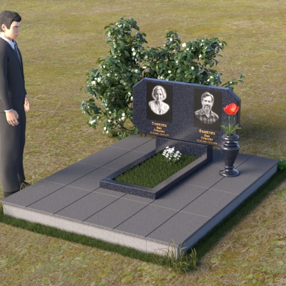 Композиция памятника строится на контрасте строгих геометрических форм и плавных линий, символизирующих жизненный путь и обретение покоя. Стела имеет форму, близкую к прямоугольнику, но с элегантно скошенными углами, смягчающими ее строгость. Верхняя часть стелы имеет две небольшие грани, словно фацеты драгоценного камня, добавляющие ей изысканности. Поверхность камня отполирована до зеркального блеска, что подчеркивает глубину черного цвета и создает ощущение торжественности. На лицевой стороне размещены портреты усопших, выполненные с высокой степенью детализации. Ниже портретов выгравированы надписи, выполненные строгим шрифтом. Справа от стелы установлена небольшая ваза, выполненная в том же стиле, что и памятник, и украшенная простым, но элегантным орнаментом.