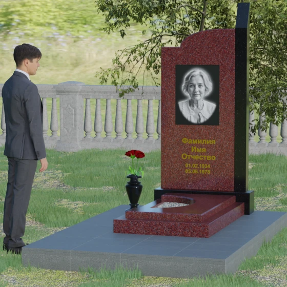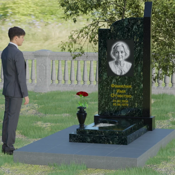Широкое полотно основной стелы открывает безграничные возможности для художественного оформления. Форма идеально подходит для размещения крупного портрета в технике гравировки с мягкой растушевкой («ореолом»), что создает эффект живого взгляда. Золоченая кириллица имен и дат особенно выразительно смотрится на темном фоне, придавая мемориалу статусность и торжественность. Для того чтобы отразить индивидуальность и характер ушедшего человека, данная модель доступна в 8 цветовых решениях. Вы можете выбрать классический черный гранит Габбро-диабаз, благородный серо-белый Мансуровский гранит, насыщенный красный Лезниковский или глубокий коричневый Дымовский. Также доступны экзотические варианты: лесной Балтик грин, искрящийся Блю Перл, контрастный амфиболит или сияющий белизной мрамор Тассо. Комбинирование двух видов камня позволяет создать уникальный контраст фактур и оттенков, подчеркивая архитектурную сложность изделия.