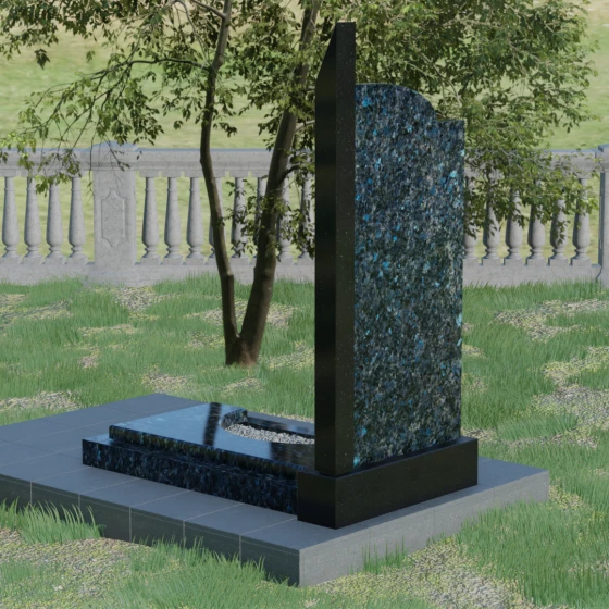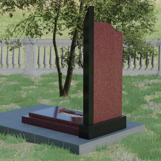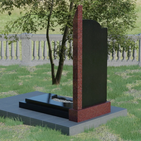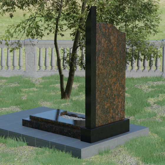 Данная мемориальная композиция представляет собой образец современного архитектурного искусства, где строгая геометрия встречается с мягкой природной грацией. Дизайн изделия построен на эстетике асимметрии: левый край стелы выполнен в виде четкого, волевого «шага», который мгновенно переходит в плавную, нисходящую дугу с правой стороны. Такая форма символизирует баланс между земной твердостью и бесконечным небесным покоем. Вертикальная стела дополнена узким акцентным столпом из контрастного камня, который создает мощную вертикаль, визуально устремляя всю конструкцию ввысь. Тщательно выверенные пропорции позволяют этому монументу органично вписаться в ландшафт любого мемориального комплекса, выделяясь своей лаконичностью и благородством линий.