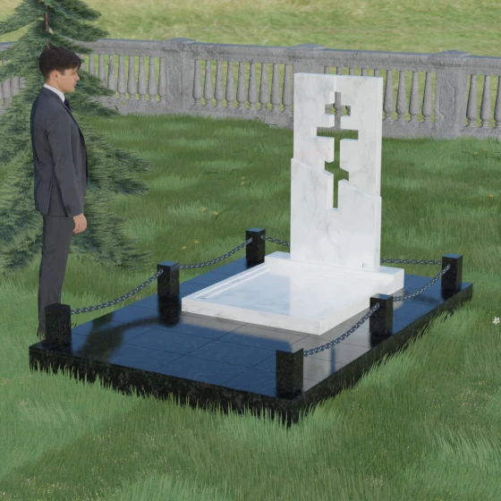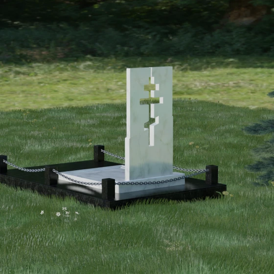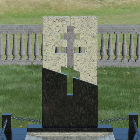 Данная модель — это торжество современной архитектуры и глубокого сакрального смысла. В центре композиции находится величественная стела, состоящая из двух контрастных блоков, разделенных динамичной диагональной линией. Этот художественный прием символизирует границу между земным и вечным, светом и тенью. Главной особенностью изделия является филигранная сквозная резьба: в самом сердце камня вырезан православный восьмиконечный крест. Лаконичность форм подчеркивает строгость и достоинство, а отсутствие лишнего декора позволяет сфокусироваться на главном символе веры.