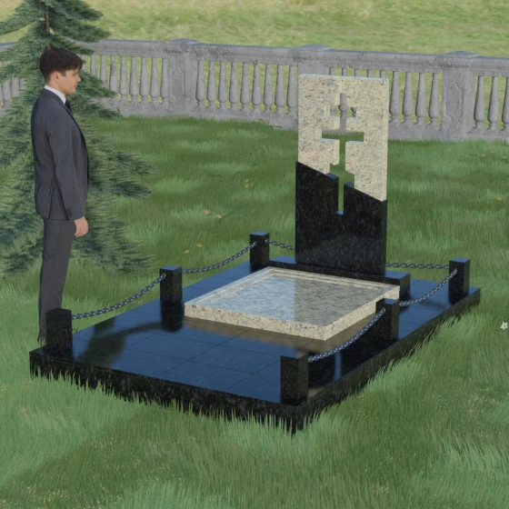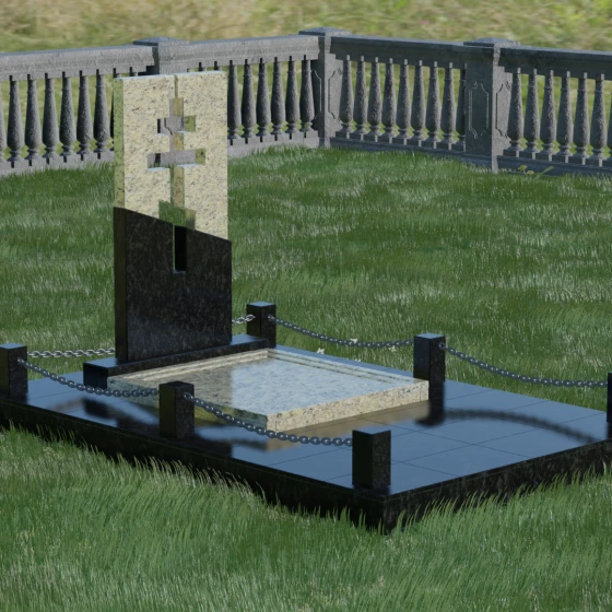 Особое внимание уделено комплексному благоустройству места захоронения. Скульптурная композиция установлена на массивный гранитный цоколь, который служит надежным фундаментом. Участок полностью закрыт сплошной надгробной плитой, выполненной в единой цветовой гамме со стелой. Такое решение не только придает мемориалу завершенный, монументальный вид, но и значительно упрощает уход за местом памяти: вам не придется бороться с сорняками или обновлять грунт. Периметр участка обозначен строгими каменными столбиками, соединенными декоративными цепями, что создает атмосферу защищенности и уединения, отделяя священное место от остального мира.