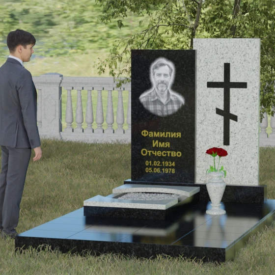 Данная модель представляет собой сложную двухкомпонентную конструкцию, построенную на гармонии противоположностей. Основной вертикальный элемент разделен на две части разного цвета и фактуры. Левая панель, выполненная из темного, глубокого камня, предназначена для центрального акцента — портрета и мемориальных надписей. Благодаря идеальной гладкости, гравировка здесь выглядит максимально четко, а портрет обретает фотографическую точность и одухотворенность. Правая часть композиции — это блок из светлого камня, на котором располагается лаконичный православный крест. Крест выполнен в строгом черном цвете, что создает мощный визуальный контраст на светлом фоне, подчеркивая духовную чистоту и значимость символа веры. Геометрия модели подчеркнуто строгая: прямые линии и четкие грани символизируют твердость характера и прямоту жизненного пути.