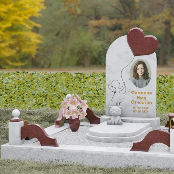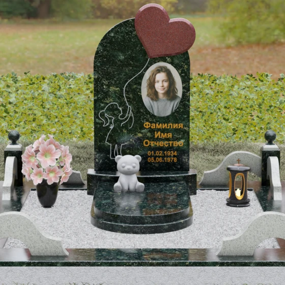 Представленная мемориальная композиция — это не просто надгробие, а глубокое художественное высказывание, в котором застыло мгновение нежности и вечной связи. Основная стела выполнена в форме изящной асимметричной арки из глубокого черного гранита. Главным акцентом ансамбля выступает объемное сердце из насыщенного красного камня, которое словно парит в воздухе, подобно легкому воздушному шару. Тонкая, едва уловимая линия резьбы соединяет этот символ любви с рукой выгравированного силуэта маленькой девочки. Мастерски исполненная гравировка ребенка с хвостиком, тянущегося вверх, придает всей конструкции невероятную легкость и трогательность. Игра контрастов здесь возведена в абсолют: зеркальная полировка черного обелиска соседствует с ярким цветом сердца, создавая эффект трехмерного пространства и визуального объема.