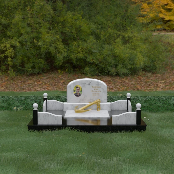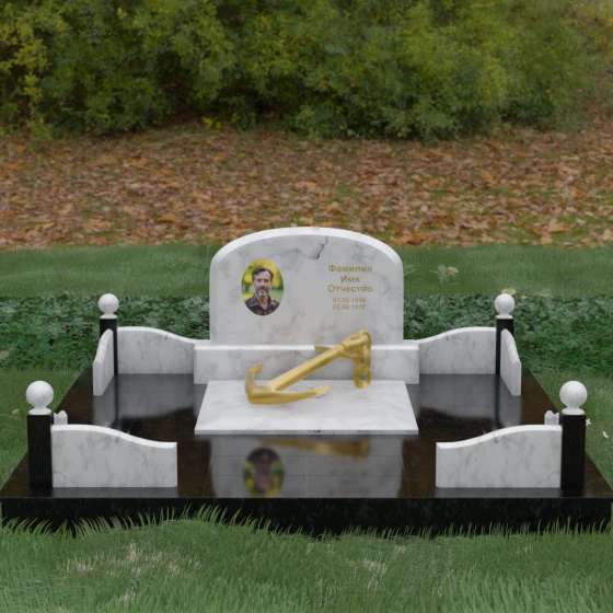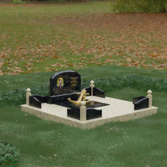 • Центральный символ: На надгробной плите расположен объемный декоративный элемент в виде золотого якоря с массивной цепью. Этот символ олицетворяет надежду, твердость характера и профессиональный путь, связанный со стихией, становясь смысловым центром всего мемориала.