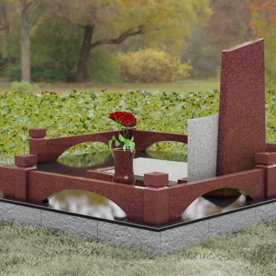 Целостность и монументальность композиции подчеркивается безупречным благоустройством участка. Мемориал установлен на массивный гранитный постамент, который переходит в сплошное мощение территории крупноформатными плитами из натурального камня. Такое решение не только создает законченный архитектурный ансамбль, но и обеспечивает исключительную долговечность конструкции, предотвращая проседание почвы и избавляя от необходимости сложного ухода. В едином стиле с основным памятником выполнены элементы декора: изящная каменная ваза для живых цветов и закрытая лампада (закрытый подсвечник) на левой стороне, чьи строгие формы идеально гармонируют с общей геометрией комплекса. Полированные до зеркального блеска грани играют на свету, создавая эффект глубины и благородного сияния.