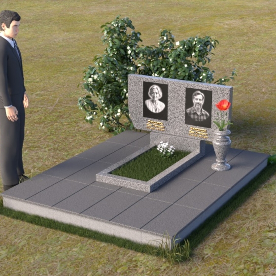 Памятник ПГ015 представляет собой композицию, состоящую из массивной стелы, горизонтальной плиты и тумбы. Стела, выполненная в форме прямоугольника со слегка скошенными верхними углами, создает ощущение надежности и основательности. Зеркальная полировка камня придает ей благородный блеск, отражая свет и создавая игру теней, подчеркивающую глубину и объем. На стеле располагаются два портрета, выполненные с высокой точностью, а также памятные надписи, выполненные золотым шрифтом. Справа от портретов, словно символ вечной памяти, размещена небольшая ваза, в которой можно разместить живые или искусственные цветы.