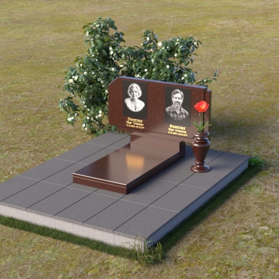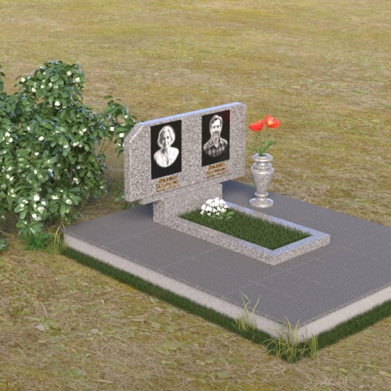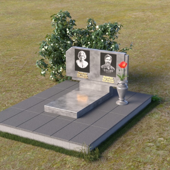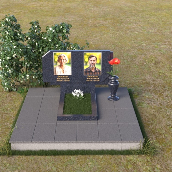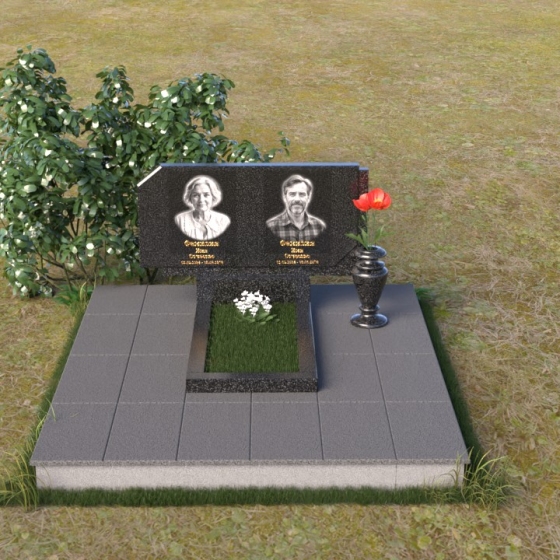 Памятник ПГ025 – это монументальное выражение скорби и вечной памяти. Его строгие линии и лаконичные формы говорят о сдержанной элегантности и глубоком уважении. Стела имеет прямоугольную форму, однако верхние углы скошены, что придает ей особую выразительность и визуальную легкость. Грани стелы тщательно отполированы, создавая зеркальную поверхность, которая отражает свет и придает камню глубину и благородство. На лицевой стороне стелы располагаются два портрета, выполненные с высокой степенью детализации. Под портретами выгравированы надписи, выполненные строгим шрифтом.