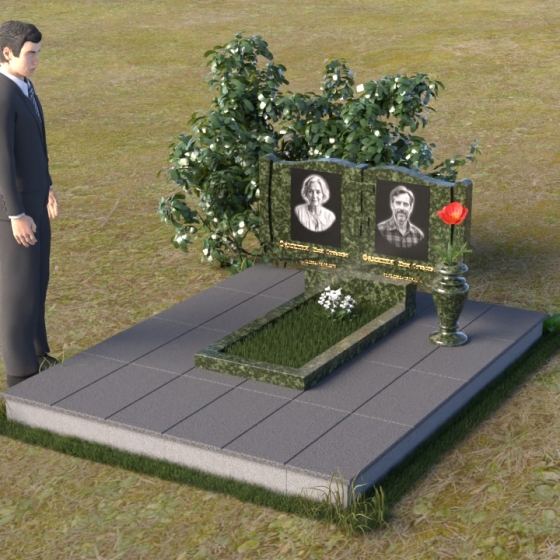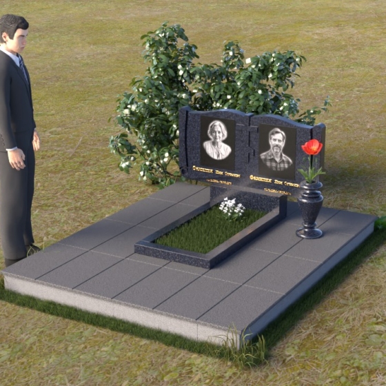 Ритуальное изделие ПГ036 представляет собой сдержанную, но исполненную достоинства композицию, созданную для сохранения памяти о близких. Два прямоугольных элемента стелы, соединенные вместе, образуют волнистый верх, напоминающий раскрытую книгу судеб. Грани обеих частей искусно обработаны, создавая мягкий, обтекаемый силуэт. Зеркальная полировка черного гранита служит идеальным фоном для гравировки портретов и надписей, словно запечатлевая светлые воспоминания в вечном камне. Слева и справа, в верхней части стелы, вырезаны лаконичные кресты, символизирующие веру и надежду. Тонкие линии врезаются в полированную поверхность, создавая игру света и тени, и добавляя глубину изображению. Горизонтальная плита, расположенная перед стелой, выполнена из того же черного гранита с зеркальной полировкой, отражая небо и окружающий пейзаж, создавая ощущение легкости и воздушности. Вместе с тем, основание памятника выполнено из серого камня, что придает всей композиции устойчивость и основательность.