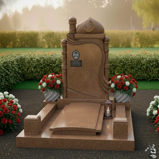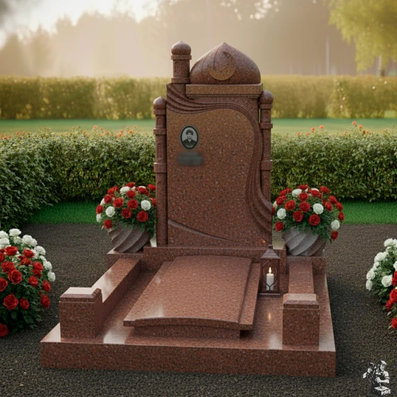 Модель ПН 088 — это не просто мемориальная плита, а подлинное произведение искусства, воплощающее в себе глубокую символику и эстетику восточной архитектуры. Центральная стела, выполненная в глубоком черном цвете, словно портал в мир воспоминаний, обрамлена изящными резными элементами. Ее форма напоминает величественную арку, увенчанную куполом мечети и полумесяцем со звездой — древними символами веры и духовности. Эти элементы выполнены с потрясающей детализацией: каждый изгиб купола, каждая грань минарета, каждый луч звезды проработан до совершенства, создавая ощущение легкости и воздушности, несмотря на монолитность камня. Изящная драпировка, струящаяся по бокам стелы, придает композиции динамичность и мягкость, символизируя скорбь и умиротворение. Контраст между зеркальной полировкой основной черной плиты, на которой будет сиять портрет и имя, и деликатной, чуть шероховатой фактурой светлых резных элементов, создает глубокий визуальный эффект, подчеркивая монументальность и изысканность. Этот контраст играет на свету, меняя оттенки и глубину, что делает монумент живым и многогранным.