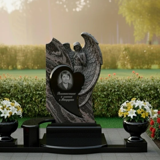 Особое внимание привлекает мастерски выполненная резьба. В верхней части стелы, словно вырастая из самого камня, мы видим объемную фигуру ангела. Его крылья, с тщательно проработанными перьями, кажутся легкими и воздушными, несмотря на твердость камня. Лик ангела обращен вверх, выражая покой и надежду, а его руки сложены в молитвенном жесте. Эта деталь несет в себе мощный символизм, предлагая утешение и напоминание о духовной связи. В центре композиции, в обрамлении сердца, расположена ниша для портрета, которая словно погружается в камень, создавая эффект глубины и интимности. Надпись выполнена изящным шрифтом, подчеркивая торжественность момента. Все грани стелы тщательно обработаны, создавая ощущение завершенности и монументальности.