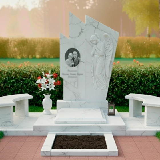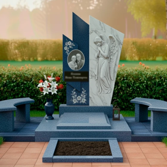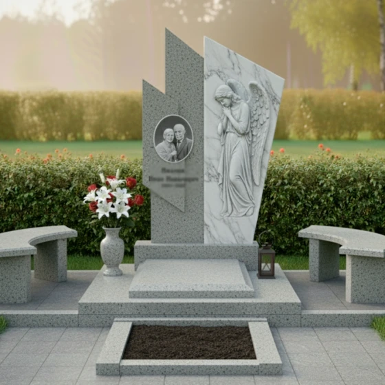 Правая часть стелы представляет собой светлую, матовую плиту, которая словно обнимает темный элемент, создавая динамичный и в то же время умиротворяющий образ. Поверхность этой плиты украшена глубокой, объемной резьбой в виде склоненного ангела с распростертыми крыльями. Каждая деталь резьбы – от складок одеяния до перьев на крыльях – выполнена с невероятной точностью и трепетом, передавая ощущение покоя и скорби. Матовая фактура камня на резном изображении ангела мягко рассеивает свет, придавая фигуре эфемерность и выразительность, в то время как зеркальная полировка темного гранита отражает окружающий мир, создавая глубокий контраст и игру света.