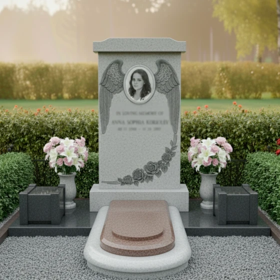 Оформление: Форма стелы ПН 135 с ее четкими линиями и плавными изгибами идеально подходит для различных видов гравировки. Овальный медальон для портрета, обрамленный крыльями ангела, создает идеальное пространство для размещения изображения усопшего, которое будет выглядеть гармонично и достойно. Пространство под портретом и цветами позволяет элегантно расположить гравировку с полным именем, датами жизни и эпитафией. Рекомендуется использовать классические шрифты, которые подчеркнут торжественность и значимость момента, а также рассмотреть возможность добавления золочения или серебрения букв для придания дополнительной выразительности и долговечности надписям. Глубокая гравировка на полированной поверхности гранита будет смотреться особенно эффектно, обеспечивая четкость и читаемость на долгие годы.
