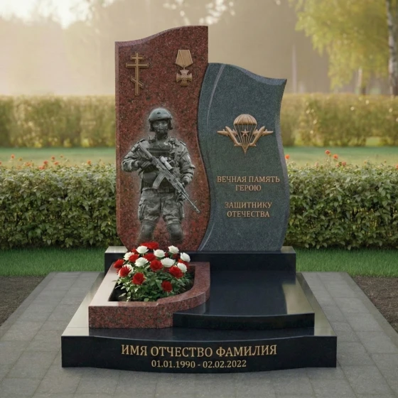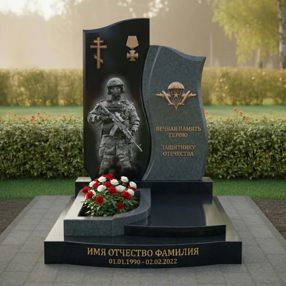 Правая стела, немного ниже и уже левой, имеет более динамичную, волнообразную форму. Ее верхняя часть плавно изгибается, создавая ощущение движения и легкости, несмотря на массивность камня. Лицевая сторона этой стелы также тщательно отполирована. В верхней части выгравирован символ Воздушно-десантных войск — парашют с крыльями, выполненный в золотистом цвете, что придает ему особую выразительность и значимость. Под ним располагаются проникновенные слова: "ВЕЧНАЯ ПАМЯТЬ ГЕРОЮ ЗАЩИТНИКУ ОТЕЧЕСТВА", выгравированные четким шрифтом, которые служат данью уважения и признательности. Боковые грани обеих стел имеют нежную, полуполированную обработку, которая мягко переходит в идеально отполированную лицевую часть, подчеркивая природную красоту камня и мастерство его обработки.
