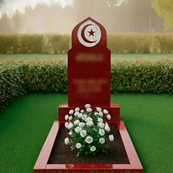Данный мемориальный ансамбль представляет собой истинное воплощение благородства и духовной глубины. Величественная стела, выполненная в форме традиционного восточного купола или стрельчатой арки, сразу приковывает взгляд своей безупречной геометрией. Главным художественным акцентом композиции является искусно интегрированный медальон из белоснежного мрамора, расположенный в верхней части обелиска. В центре этого светлого круга филигранно вырезаны символы веры — полумесяц и пятиконечная звезда. Контраст между глубоким темным цветом основного камня и матовой чистотой мраморной вставки создает эффект небесного свечения, подчеркивая торжественность и значимость момента памяти. Плавные, но при этом строгие линии резьбы по контуру стелы свидетельствуют о высочайшем уровне камнерезного мастерства, превращая холодный камень в одухотворенное изваяние.