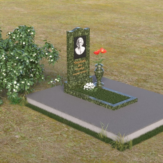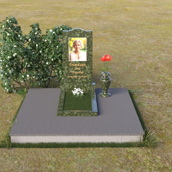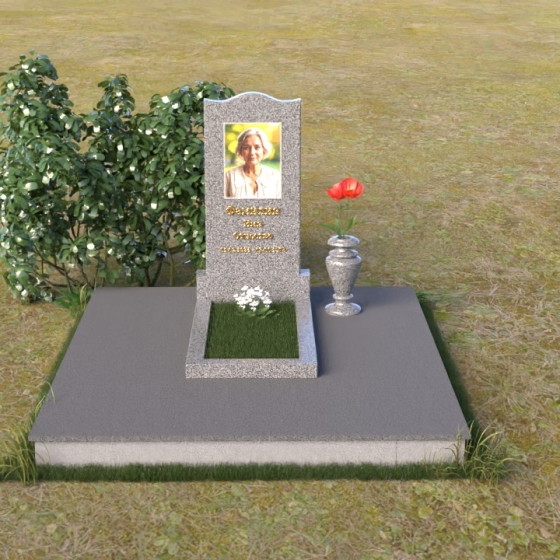 Величественная стела памятника ПВ 008 представляет собой элегантное сочетание строгих линий и плавных изгибов. Верхняя часть стелы имеет волнообразную форму, смягчающую строгость камня и придающую ей утонченность. Грани стелы тщательно отполированы до зеркального блеска, отражая свет и создавая ощущение легкости и воздушности. На лицевой стороне стелы размещен портрет усопшего, выполненный методом гравировки. Ниже располагаются надпись с именем и датами жизни. Под стелой расположена горизонтальная плита, также выполненная из полированного гранита. Ее строгие прямоугольные формы контрастируют с плавными линиями стелы, подчеркивая ее выразительность. Фаски по периметру плиты смягчают углы и придают ей завершенный вид. Рядом со стелой установлена небольшая ваза из темного гранита с изящным орнаментом, предназначенная для живых цветов.