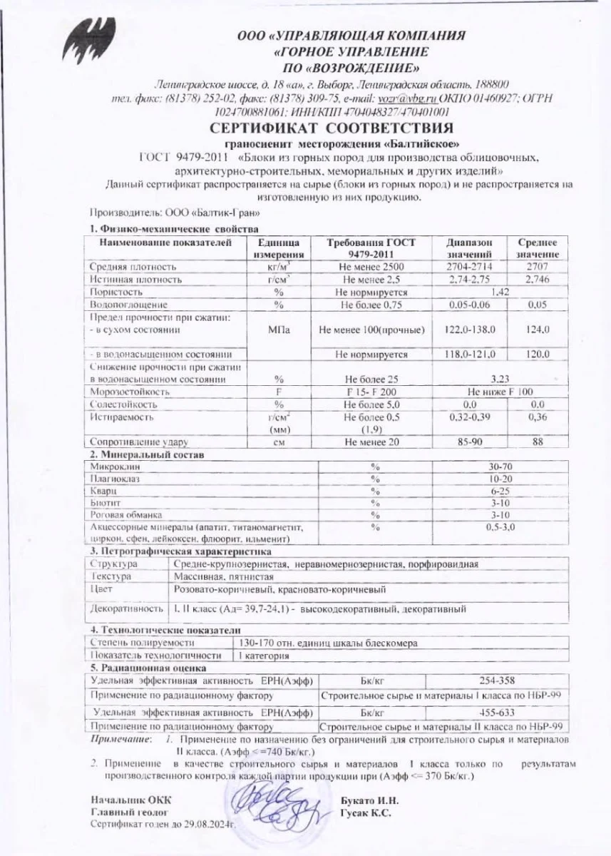 Мы хотим, чтобы вы были абсолютно уверены в качестве и безопасности материала, из которого будет изготовлен памятник для ваших близких. Поэтому мы публикуем сертификаты соответствия на основные виды гранита, которые мы используем в работе.